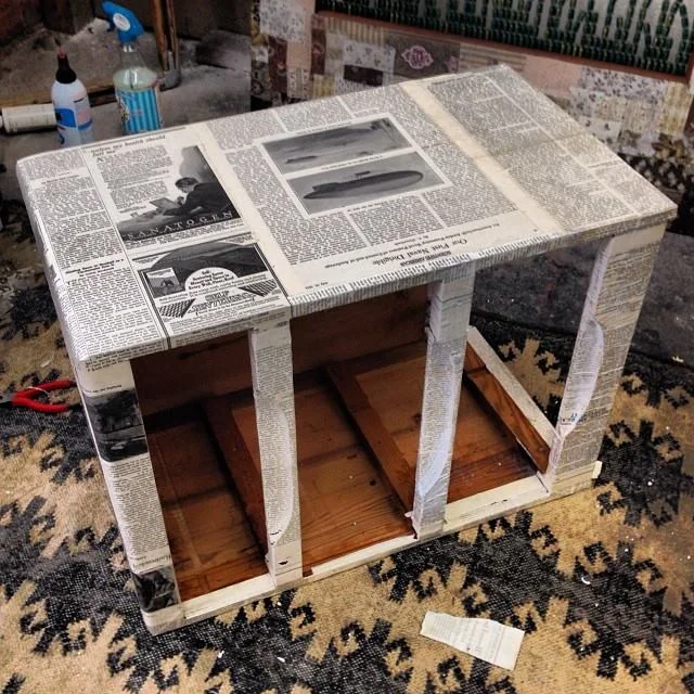 I decided to cover the surface of the frame with old newspaper... And by old, i really mean antique. These are actual issues of Scientific American from 1915! Some of the incredible images in the articles include early zeppelin flights and photos of the New York Subway System as it was being constructed. It might seem like i'm ruining these pieces of history by using them in a collage, but i prefer to think of it as immortalizing them.