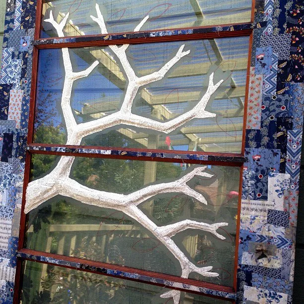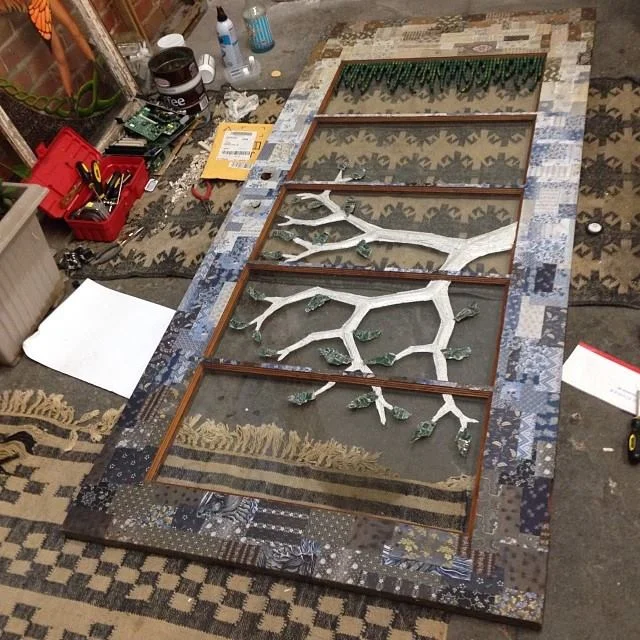 Beginning the glass collage part of the French Door Project... The idea here is to build up a life-size tree and grass in the insets of the door, then fill the panels with polyurethane resin to seal and stabilize the collage.